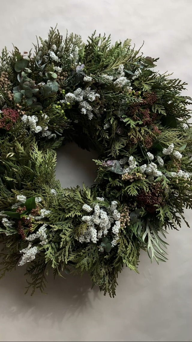 「冬のリース」 少しずつ季節が秋から冬へと移り変わっていきます。 PAUSEでは、毎年ご好評いただいている冬のリースを、より長い期間お楽しみいただけるようにご用意致しました。 リースはフレッシュな植物 をたっぷりと使って仕立てます。飾り始めは瑞々しい緑の表情を。 やがて時間の経過とともに、ゆるやかにドライへと変化していく姿を暮らしの中で味わっていただけます。 ひとつのリースとともに、移ろう季節を楽しむ特別な時間をお届けします。 ※写真はイメージになります。 <サイズ> 花材にもよりますが、直径約20cmのベースを使用し、直径約25cm前後の仕上がりになります。 <リースとは> 丸い形は「人に安心感を与える形」と言われています。 リースには「幸福を呼び込むお守り」や丸い形には終わりがない事から「永遠」という意味があります。 「幸せが永遠に続きますように」という願いを込めてお祝い事などにも喜ばれています。 生花と違い水につけず壁に掛けたり、棚や玄関外に飾ったり自由にインテリアとしてもお楽しみいただけます。 <発送日> 出来上がり次第順次発送開始 <配送について> ヤマト運輸にて配送致します リースは梱包をしダンボール箱に入れてお届け致します。 破損などございましたら早急にご対応させて頂きますのでご連絡下さい <お振込について> 振込先情報は購入完了メールに記載されております。 恐れ入りますが振込手数料はお客様の負担でお願い致します。