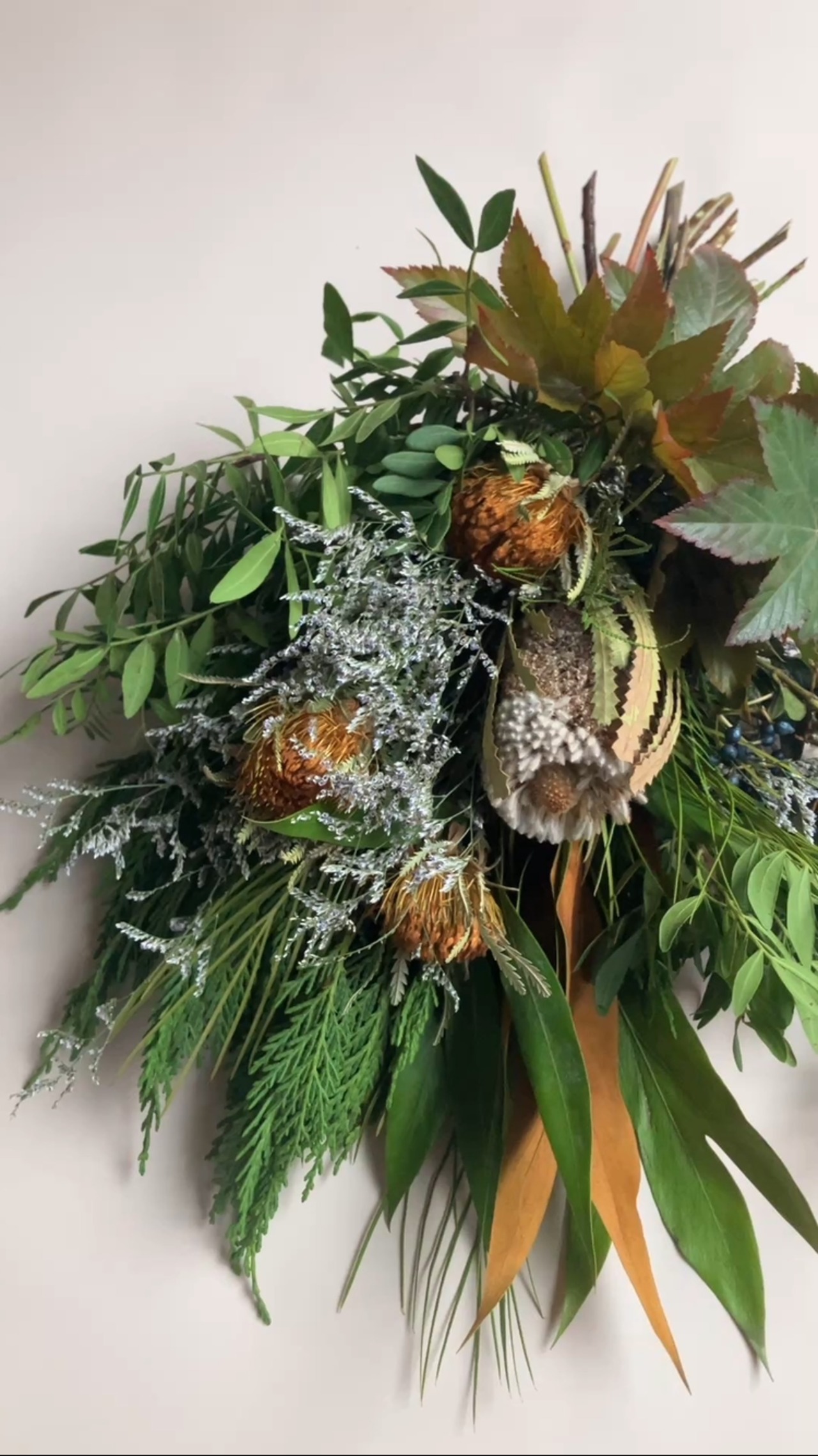今回のスワッグは、すでにドライフラワーになっている素材とフレッシュな植物を束ねて制作しています。
