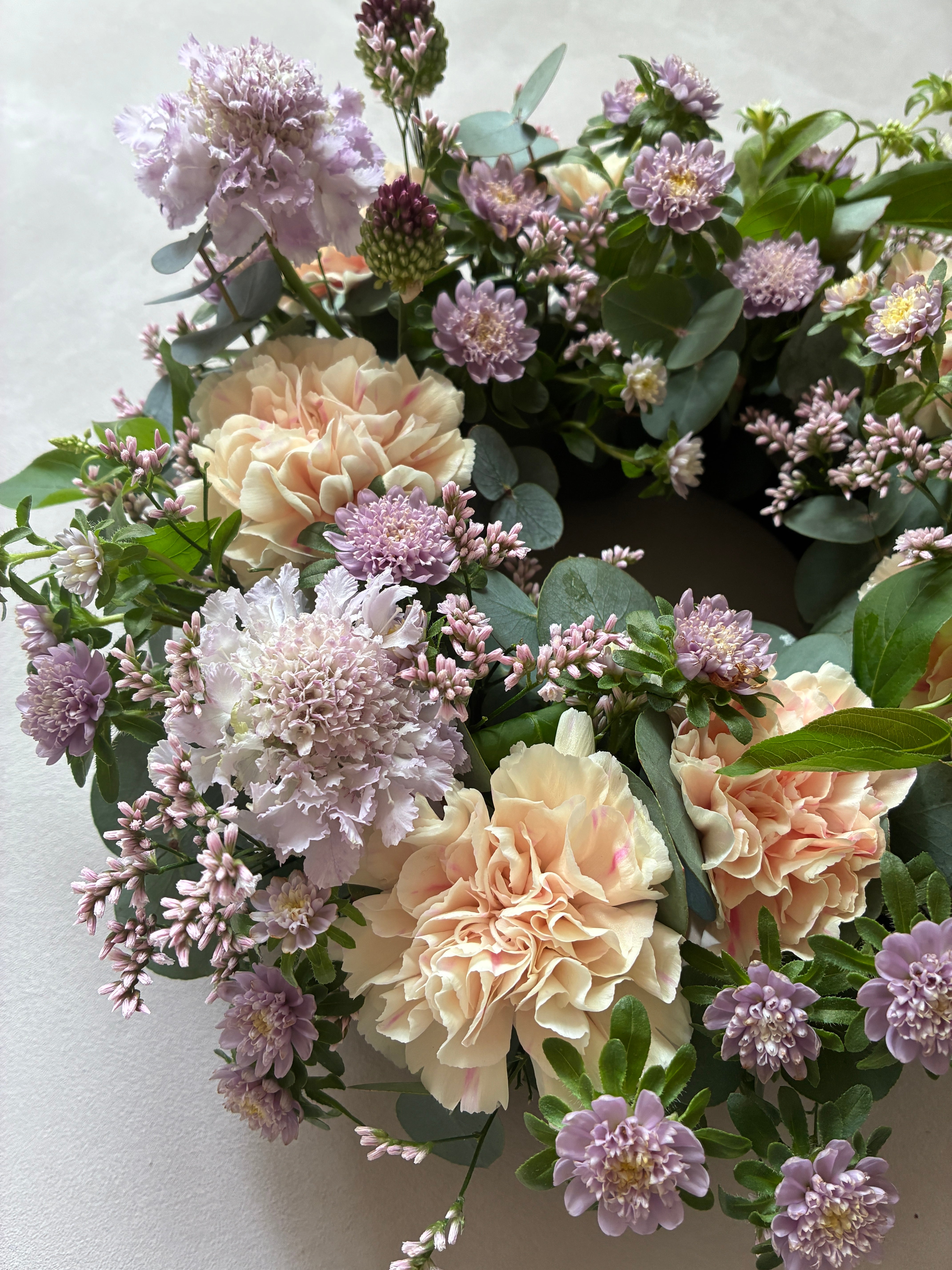 スカビオーサ、アリウム、アスター、リモニューム、ユーカリなど、小さな花々とグリーンをたっぷりとアレンジしたテーブルリース。